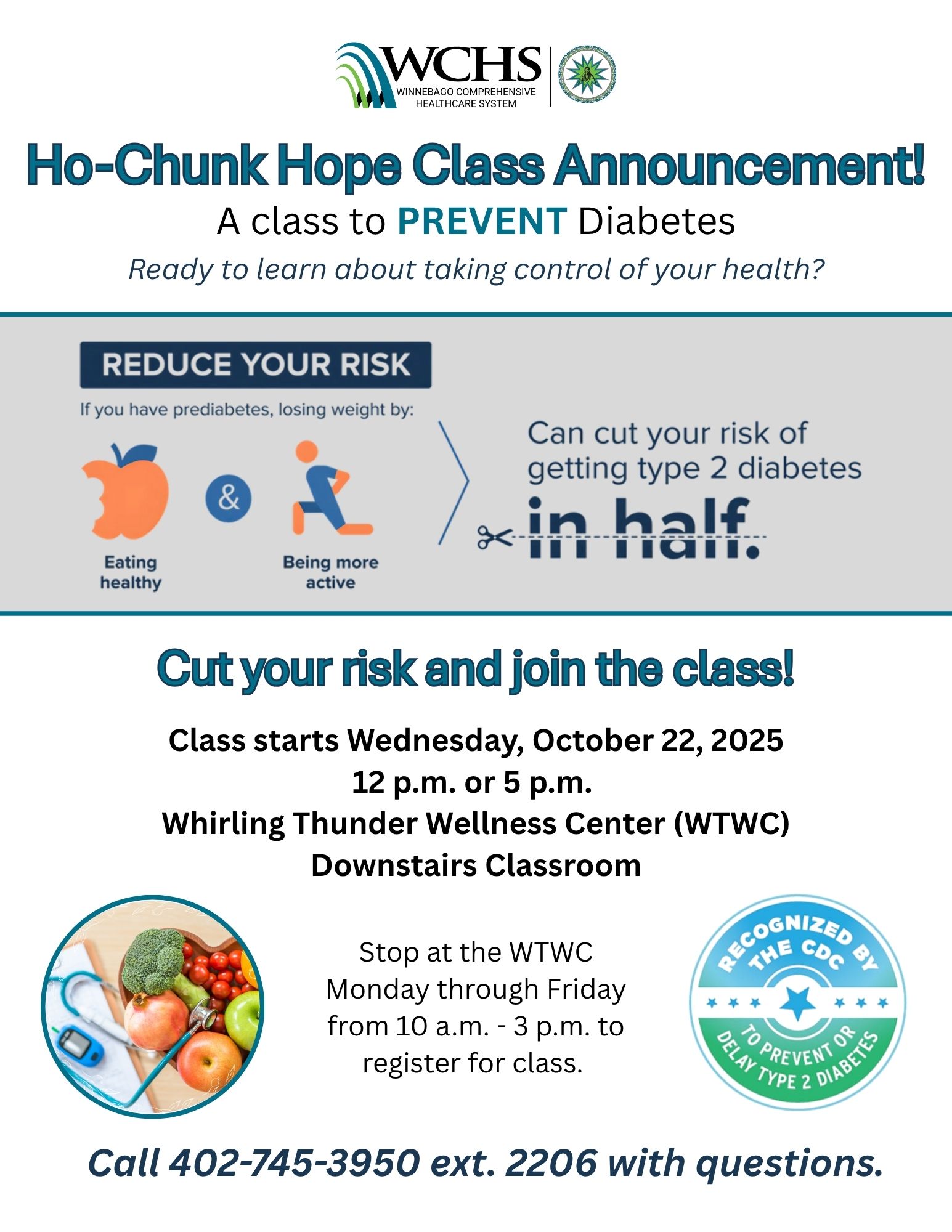 Ho-Chunk Hope is a year-long diabetes prevention class that is offered for prediabetic adults who either have or are at risk for developing diabetes. The Ho Chunk Hope class has been recognized by the CDC since 2017. Ho-Chunk Hope participants' goals are to cut their risk in half by losing 5-7% of their body weight. All registered participants receive education, guidance, and support on everything from nutrition to fitness via weekly classes for 4 months, bi-weekly classes for 2 months, and monthly classes for the last 6 months led by certified Lifestyle coaches. Interested? Sign up here.