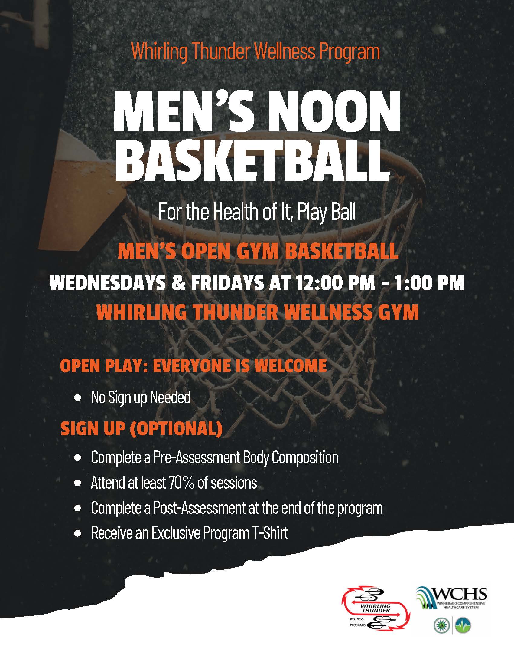 Hosted by the Whirling Thunder Wellness Program, this event invites men to enjoy open gym basketball for fitness and fun. Games take place every Wednesday and Friday from 12:00 PM to 1:00 PM at the Whirling Thunder Wellness Gym.